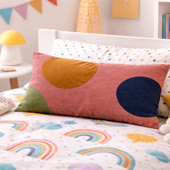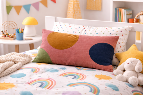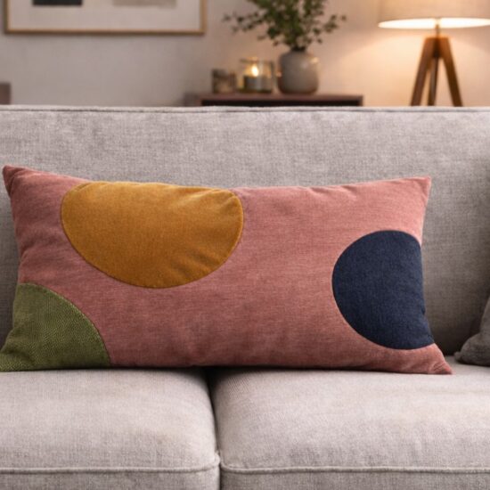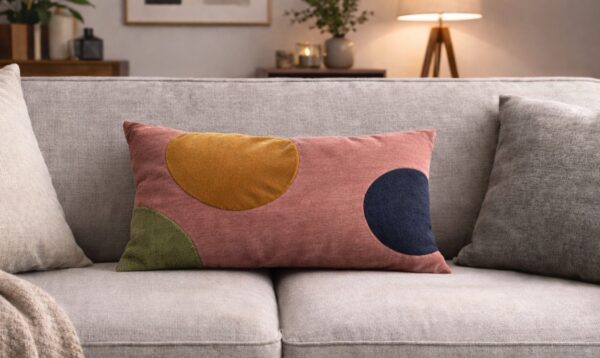 Stylowa poduszka dekoracyjna o nowoczesnym, abstrakcyjnym wzorze, wypełniona sprężystą włókniną tapicerską. Tło w odcieniu przygaszonego różu uzupełniają kontrastujące akcenty: musztardowy, granatowy oraz oliwkowa zieleń. Kolory są ciepłe i harmonijne, łatwe do zestawienia z jasnymi i neutralnymi meblami.