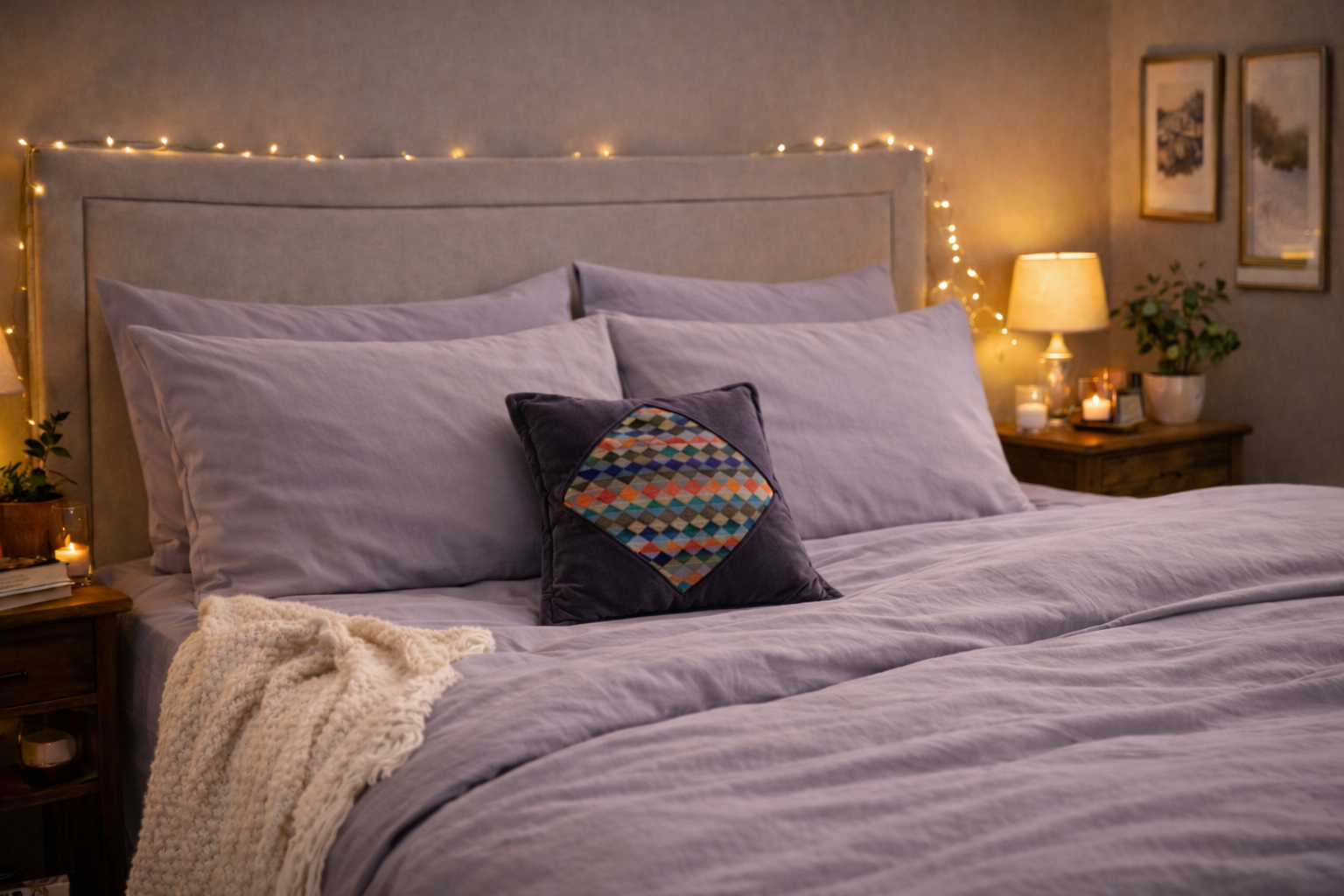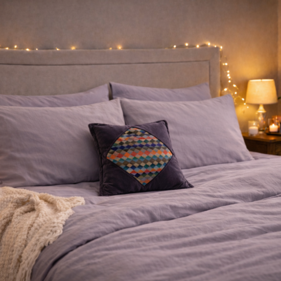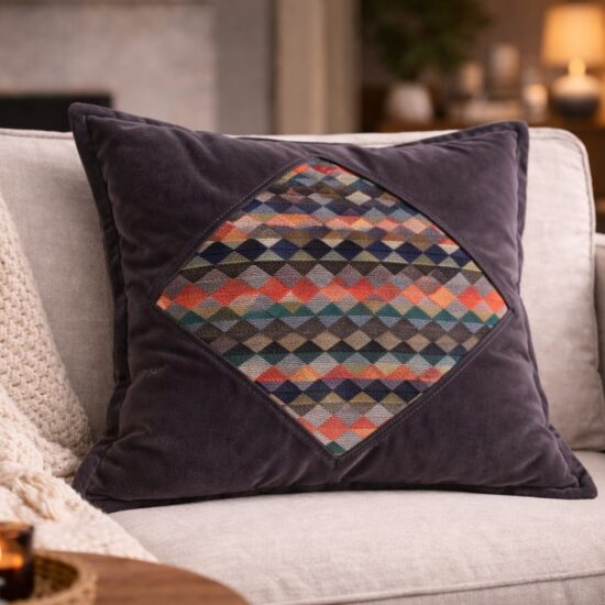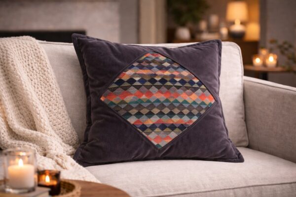 Poduszka dekoracyjna, która łączy miękkość z wyrazistym wzornictwem. Jej zewnętrzna część wykonana jest z aksamitnej tkaniny w głębokim odcieniu grafitu; centralny panel zdobi wzór złożony z drobnych rombów w wielu kolorach – od ciepłych czerwieni i pomarańczy po chłodne błękity i zielenie. Kontrast pomiędzy gładką, miękką tkaniną a kolorową strukturą środka tworzy interesujący efekt dekoracyjny.