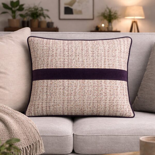 Prostokątna poduszka z wyrazistym, fioletowym obszyciem i aksamitnym paskiem na środku,  wypełniona sprężystą włókniną tapicerską.