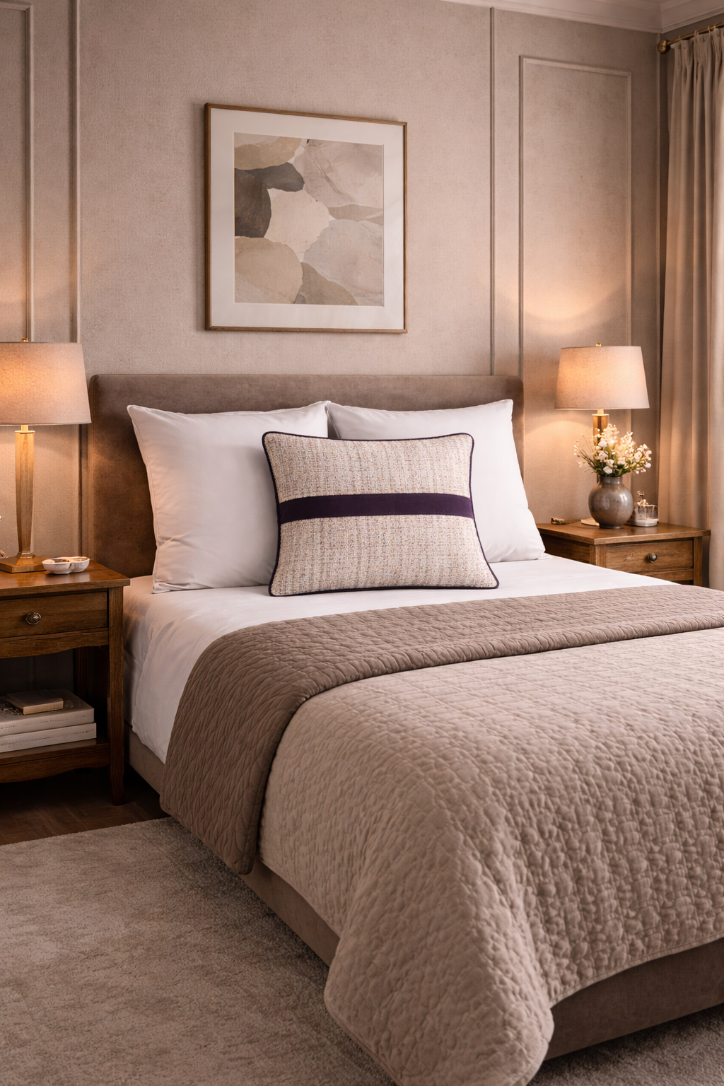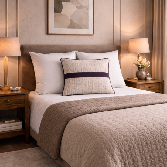 Jasna, strukturalna tkanina pięknie kontrastuje z ciemnymi akcentami, tworząc stylowy dodatek do salonu lub sypialni.