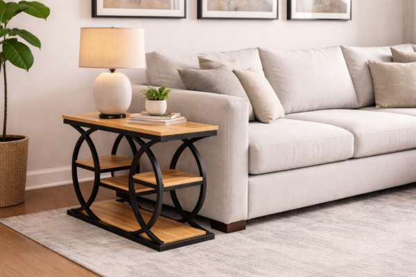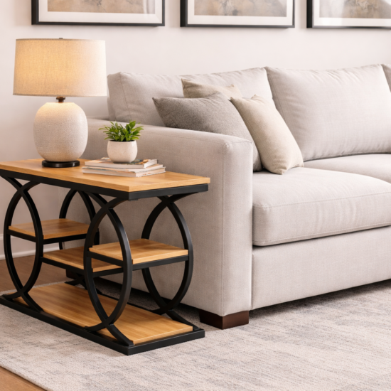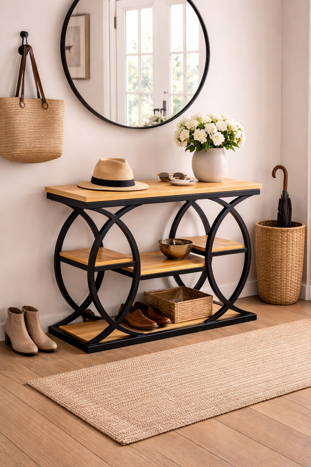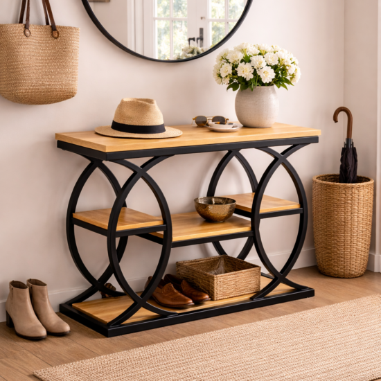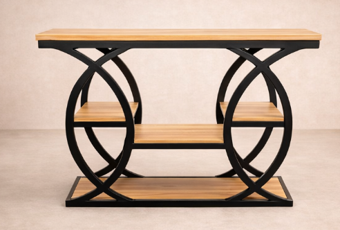 Elegancki stolik konsolowy wykonany z naturalnego drewna, łączący nowoczesną formę z funkcjonalnością. Konstrukcja mebla opiera się na okrągłych bokach, które nadają mu lekkości i wyjątkowego stylu. Gładki blat oraz dwie praktyczne półki zapewniają wygodne miejsce do przechowywania i eksponowania dekoracji. Dzięki swojej uniwersalnej formie stolik doskonale sprawdzi się w przedpokoju, salonie lub sypialni.