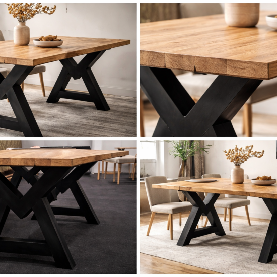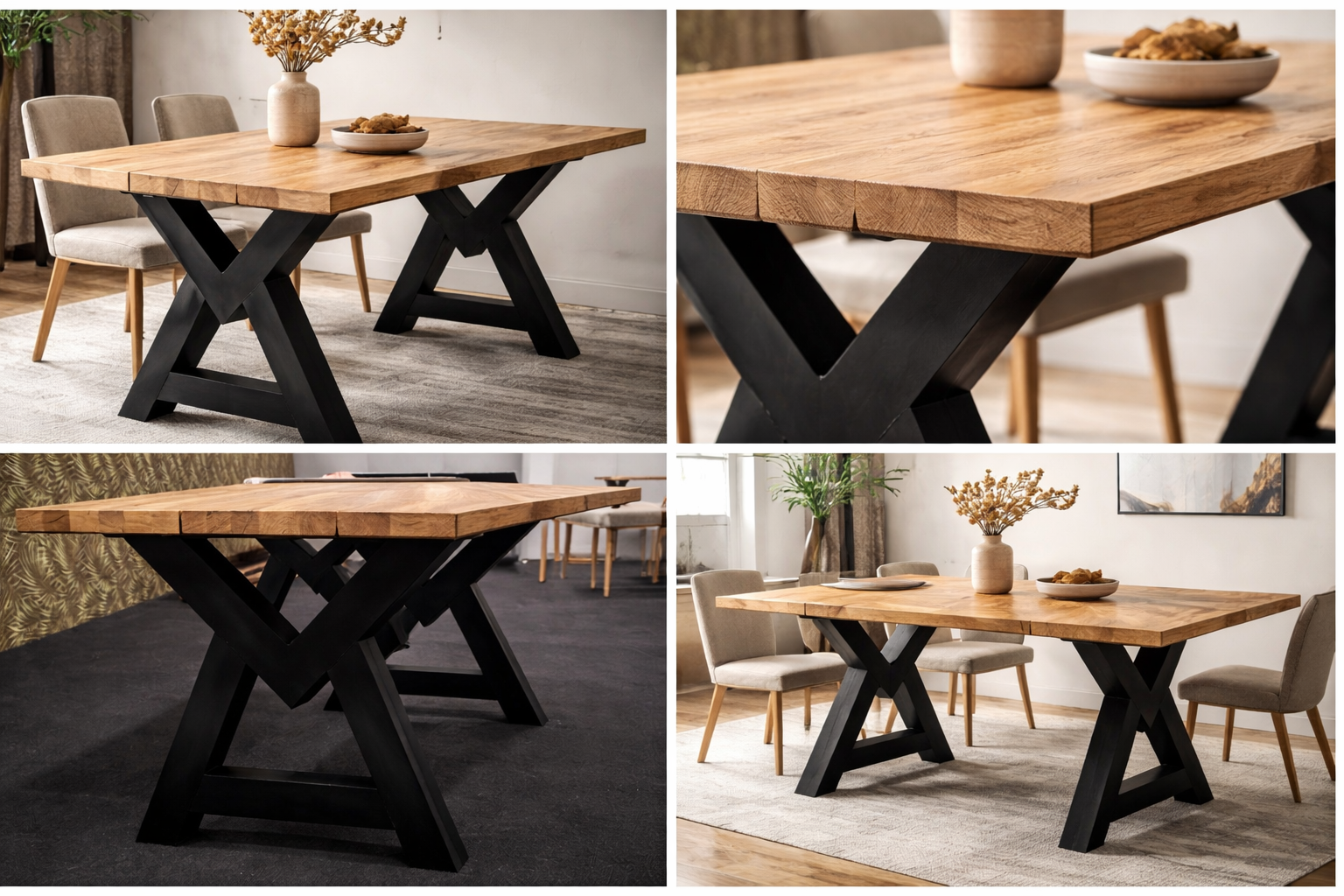 Solidny, ciężki stół wykonany z litego drewna dębowego; połączenie trwałości,  naturalnego piękna i nowoczesnego designu. Blat z prawdziwego dębu zachwyca wyraźną, unikalną strukturą drewna oraz naturalnymi sękami. Masywne nogi drewniane zapewniają wyjątkową wytrzymałość i bezpieczeństwo użytkowania.